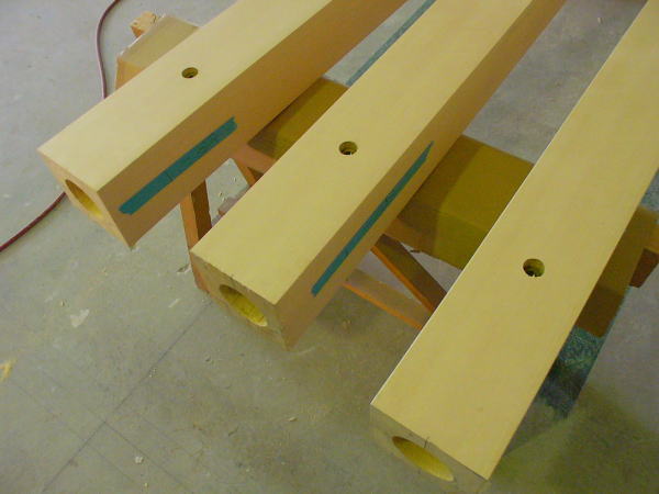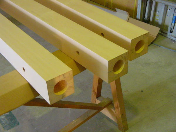 現場で、支給された四面無節の柱に機械加工で正確な穴を開け、金具底部を床墨に合わせ固定、柱を立て、柱にピンを入れ仮固定し、穴隠しの込み栓を仮打ち込みし完了です。現場の職人に組み立て方を指導し、現場立会検査を受け、「合格」 所要時間4時間、柱3本建ての工事が無事終了し帰途につきました。