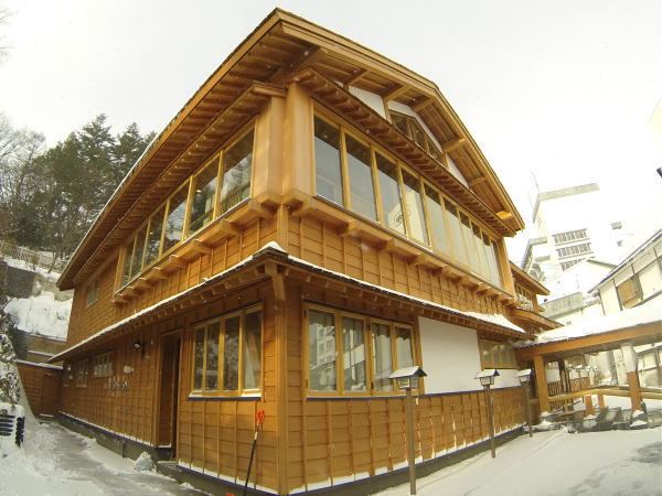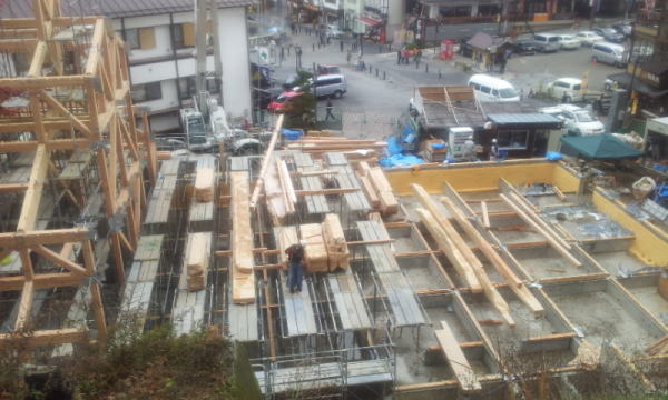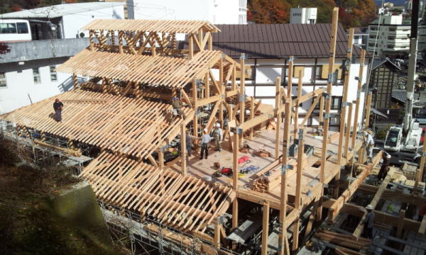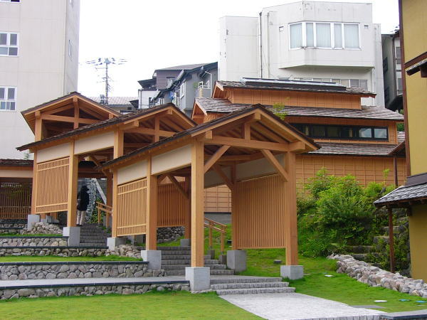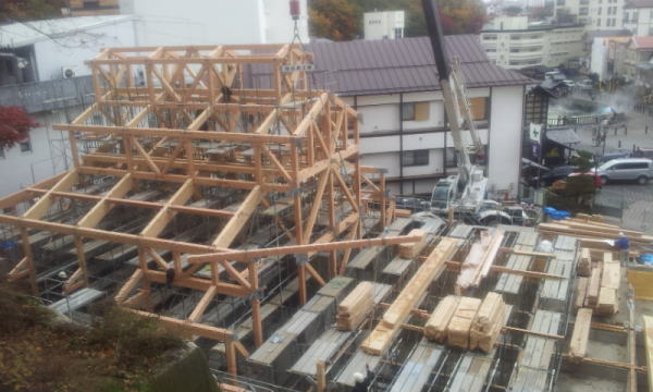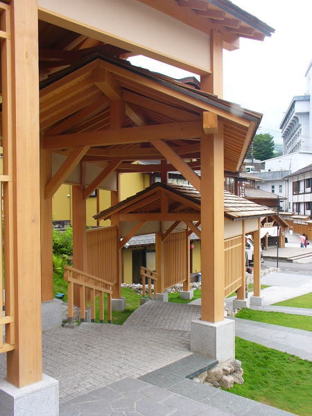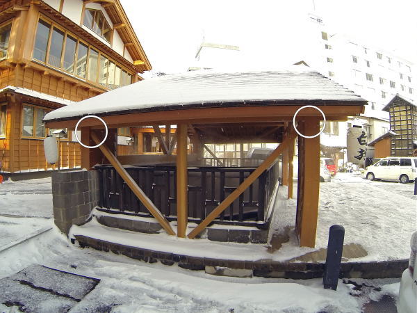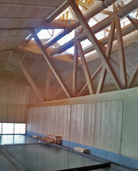 草津町の湯畑南西側に整備される、述べ床面積約730平方メートルの温泉施設で石張りと木の2種類の浴室に「湯畑」「万代鉱」の2源泉をもつ、その温泉施設の浴室天井の梁の頬杖の中と気抜き換気の上部梁の中にステンレス製のアフタイトが採用されました。(二重丸の位置)2013年4月(春)に完成しました。