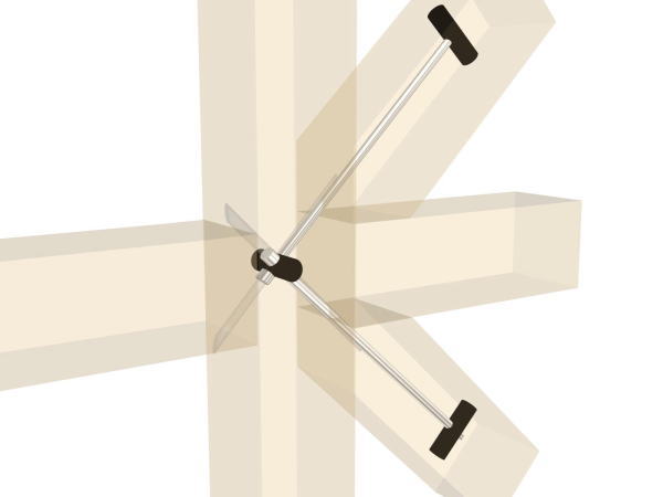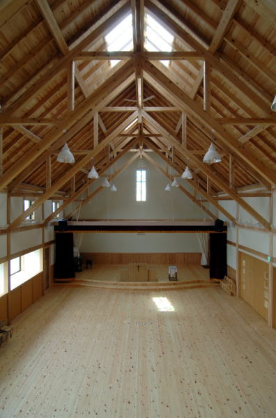 前橋市、県産杉材を使用、保育室の天井上のトラス組みでV型のアフタイトを新たに開発耐用しました。梁上部の逆V型金具と梁下のV型金具で、組み始めは、下材側から組み付け上材を乗せ上材、上場からボルトを差込み組み上げ完了です。当時は、金物が見えなくボルト類も見えない構法は、見当たらず県内初の木組みトラスでした。また、ホールのトラス組みも同じように組み付けて組立た物でトラス組みと筋カイの構造部の中にアフタイトが隠れていて見えません。とても綺麗な骨組みに仕上がっています。