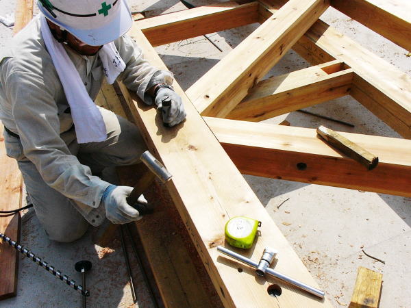 組み付け調整中の梁