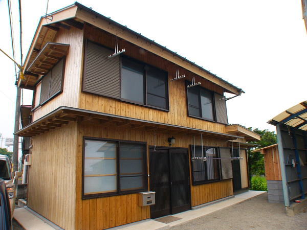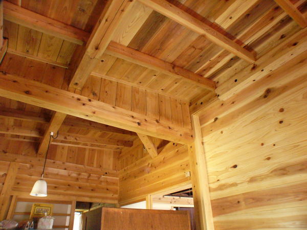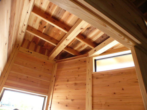 榛東村。榛名山杉材使用、三角形の土地のため工夫をこらした建物で、前回のリフォームの時に既存の建物の桁・母屋の中にアフタイトの両引の先付け側の部品を忍ばしておき今回のリフォームでジョイントして桁・母屋を繋ぎ下屋を増設しました。増設の目的は、二階建て御母屋本体が古く、耐震強度が低いため、周りの下屋で御母屋を支えるように取り囲み、骨組み構造材が目視点検できるように現しにした建物です。