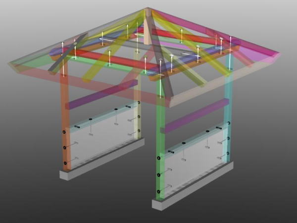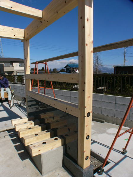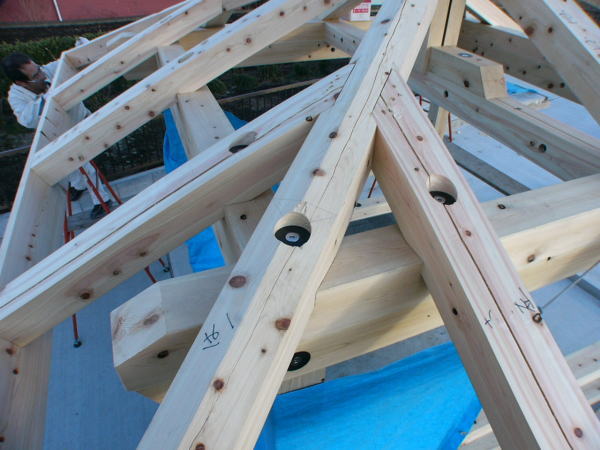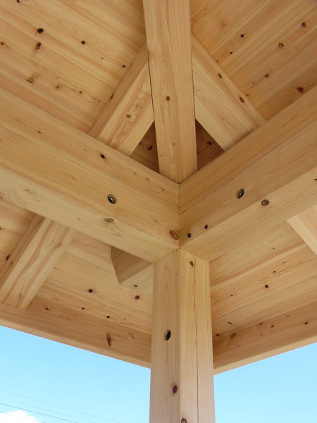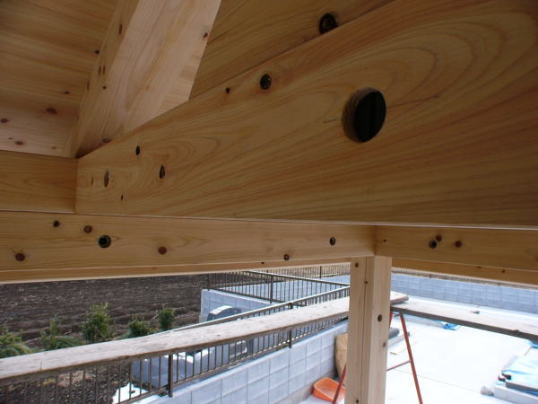 榛名山の檜一等材120×120を全ての部材に使用。基礎となる花崗岩(御影石)の中に穴を開けアフタイトのステンレスピンを埋め込み、柱・土台より片引で固定させ、強度を確保。桁・垂木は片引き交差ピンで固定。