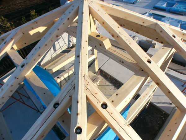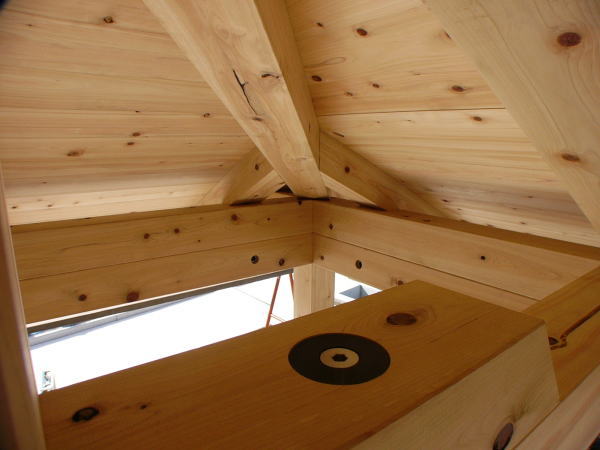 隅木はロング片引で桁を貫き柱で固定、野地板は檜一等の30mmの本実加工板を75㎜ビスで固定、屋根はステンレス地金焼付け塗装平葺き、樋は銅製。