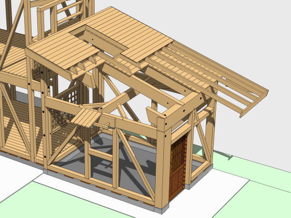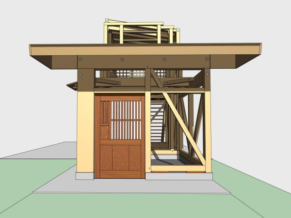 黄金比率(名詞の縦・横のサイズ)の寸法に以前から興味があり、何かに生かせないかとか思案、たまたま、120年前の蔵扉の復元改修をしたこともあり、蔵扉に黄金比率を取り入れることに辿りつき、ケヤキ材を使った、オリジナル蔵扉を再現することにしました。制作は、いきなり図面を作成するのではなく、ラフ図を描き、それを素にCGでの蔵扉の再現を始め、扉寸法の縦・横の各部分の長さやパーツ割が決定され、そこで得られた基準比率により建物バランスの寸法を求めました。また、現代版の蔵扉ですのでペアガラスの使用や網戸のプランなども視野に入れCG作成し、それぞれを基に図案化し、熟練の建具屋さんの手により制作され、塗装も柿シブで仕上げています。また、それと、同じくして和民家全体のCG画像の作成に取り掛かり、金具の位置・透明画像・360度あらゆる角度からの立体画像を完成させました。