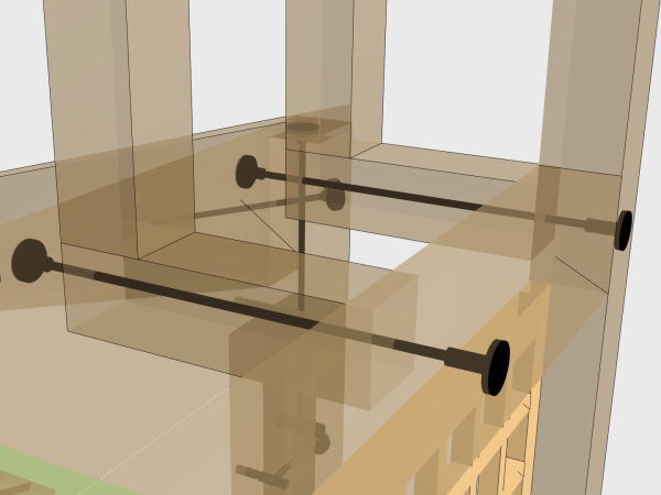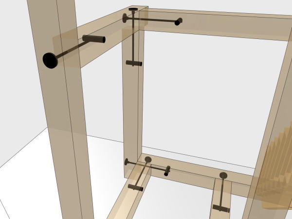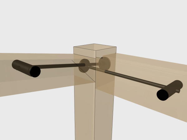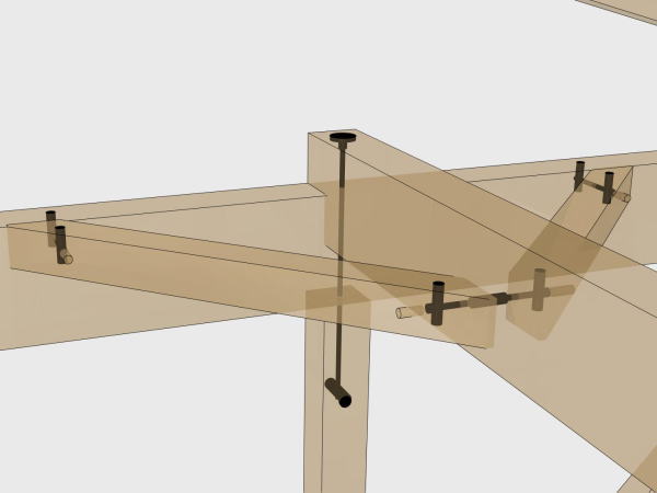 柱・梁等の構造木材は、二つの役目を持っています。組まれた時に離れないようにと、荷重に耐え支えることです。一般には、組まれると離れない複雑な仕掛けが木材には、加工されています。しかし、加工部は引抜き耐力が乏しいため、金物を通し補強しているのが現状です。もし、金物に耐力があるならば、しかも、木材の中心部に金物が取り付けられれば変形しにくくなるはずですし、木組みの複雑な仕掛けも不要になるはずです。アフタイトは、加工部の構造解析の結果、木組み木材から二つの役目を切り離し、離れる引抜きをアフタイトが負担することにより木材の、欠損部位を減らすことで荷重量を増すことを可能にし、加工部分も単純化できました。アフタイトは、締め直しも出来ますが、分解も簡単に行なえ、数百年かの後の建物解体時にも、柱・梁を切断することなく取り外せ、木材のリユース・リサイクルにも生かせるよう工夫されていて、何世代か後も経済的です。樹技の住家は、全てを見せるように、木組みが損なわれないように工夫されていて、金具使用量は約200を超えていますが、使用存在感がまったくなく、ごく自然です。また、重要な場所には勿論ですが、金具の不必要な箇所にも使用し、金具の違和感の無いところや、一般金物の問題点などと比較し金物のあり方や考え方をもう一度検証していただきたくなるような、意匠に出来上がっています。