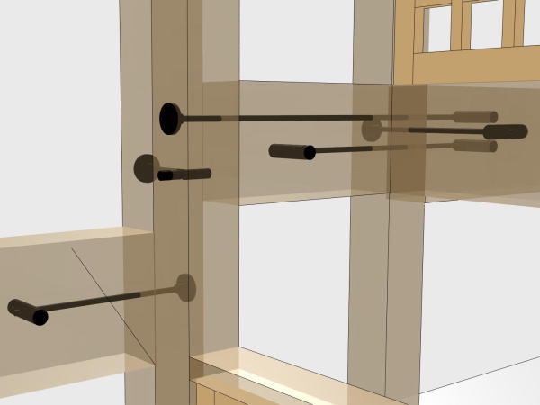 一般の金具類は木組みには適していません。なぜならば、市販金物は材料(木材)表面に取り付けるよう設計されていて、木材内部に埋め込むような隠す工夫はされていないからです。仮に、その表面の金具をカマボコ板状の木材で覆い隠しても、木材表面は金物を隠した板のため凹凸になりスッキリするどころか、異物が付いているように見え、住家の木組みの美しさを生かせません。しかも、表面メッキも錆まで70時間の企画品のため、木材の含水率いかんで簡単に錆びてしまします。また、引き抜き強度も高く設計されていませんし、隠すため後締め直しも出来ません。座金等の穴の切欠部分は、埋めても欠損した箇所は元の材料強度には戻りませんし、失敗した所に埋め木をしてごまかしたみたいに見えます。いまだに多い、金具がむき出しでも、気にしない設計事務所や工務店もいますが、プロの意匠センスを疑れます。そんな数々のその場しのぎのごまかしを止め、手間をかけずにスッキリと綺麗に収める技術を木組みに生かす力に変えたものがアフタイトです。