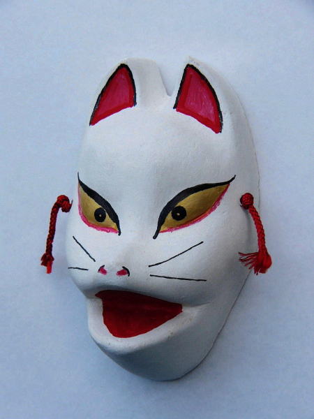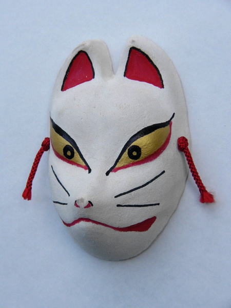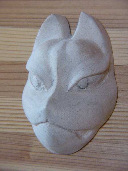 おがくず粘土で原型を製作、樹脂で型を取りその中におがくず粘土を入れ、乾いたら型抜きし、胡粉を塗り赤糸を通し完成です。祭り当日、販売し、絵付け体験を実施しています。 大・小 二種類のお面を用意しています。(大1.200円~)