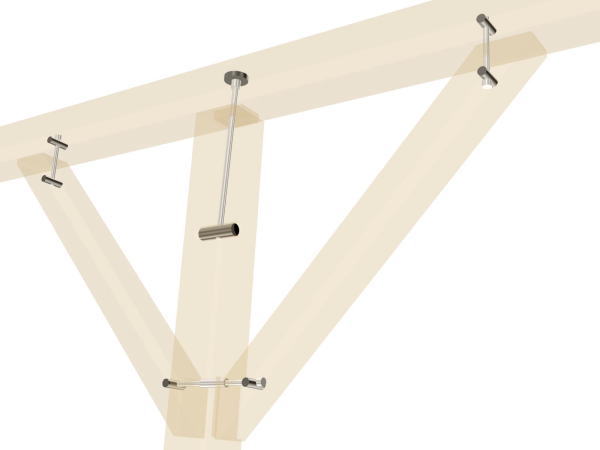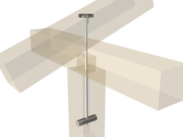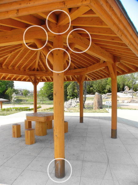 県産杉材の東屋、近づいて建物を見ますと、柱や桁に沢山の突起したダボが見えます。一見すると木栓ダボで木組み構成されているように見えますが、実は、その中にアフタイトが隠し込んであり、アフタイトで木材を接合しています。(丸印の場所)また、6箇所の隅木は、桁、柱、とロングボルトでガッチリと組まれていて屋根の浮き上がりに対抗していますし、その柱の根元には、ホールダウンが配置してあり地面からの引き抜きに対抗しています。つまり、強風でも屋根や柱が浮くことはありませんし、地震の揺れは、火打・頬杖が対抗します。