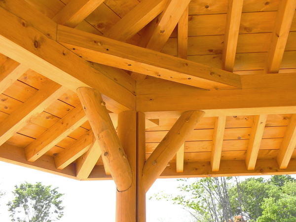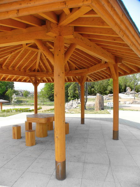 柱は、キザミ加工された後、ろくろ加工され、均一な寸法の丸太に仕上がっています。柱や桁には、腐敗を考慮したオイル仕上げが施してあり風雨に耐えるように施工されています。バランス良い綺麗な建物に仕上がっています。